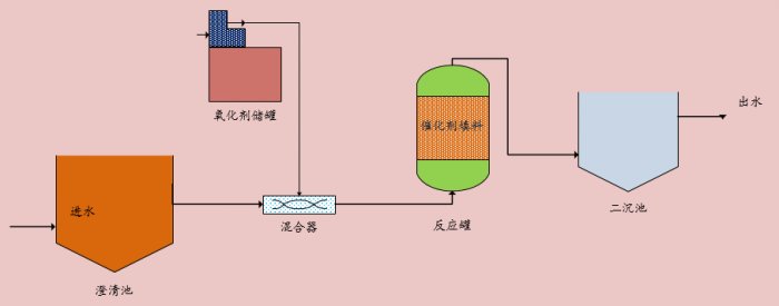 該工藝核心在于高污染物廢水中的難降解污染物在氧化劑與催化劑的作用下降解為小分子有機(jī)物,B/C比提高至0.3以上,廢水進(jìn)入生化處理單元處理并達(dá)標(biāo)排放。